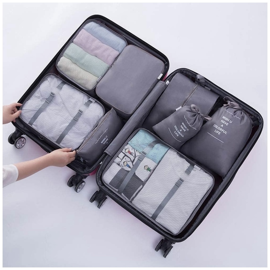 Дорожный набор Nubu из 8 предметов. 1. Мешок для стирки: 26*15*9 см. 2. Плоский карман: 27*12 см. 3. Сумка для обуви: 36*21 см. 4. Сумка для белья: 28*20*12 см. 5. Сумка на шнурке: 35*27 см. 6. Маленькая сетчатая сумка: 30*20*12 см. 7. Сетчатая сумка: 30*28*12 см. 8. Большая сетчатая сумка: 40*30*12 см.