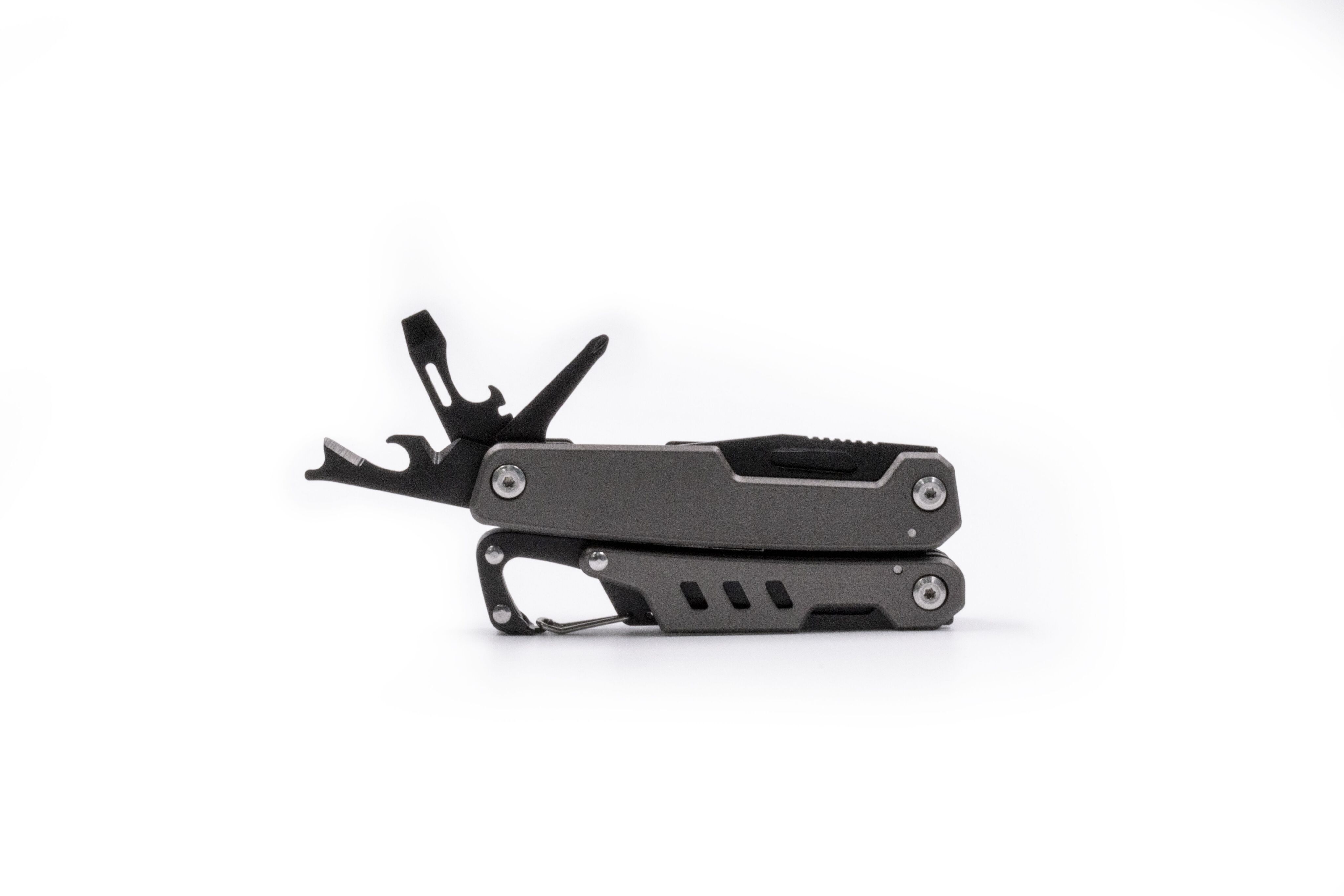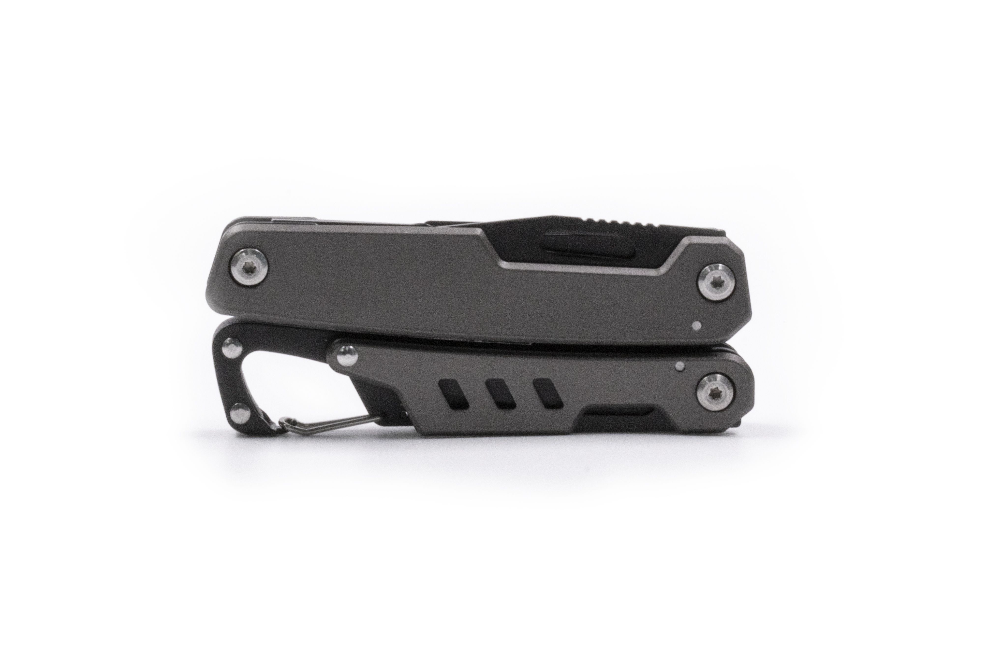Многофункциональный инструмент 11-в-1 в компактном корпусе из закалённой нержавеющей стали. Включает: плоскогубцы и острогубцы, кусачки, инструмент для зачистки кабеля, нож с фиксатором лезвия, пила по дереву с фиксатором лезвия, крестовая и плоская отвёртки, открывалка для бутылок, консервный нож, карабин. Поставляется с чехлом для крепления на поясе.
